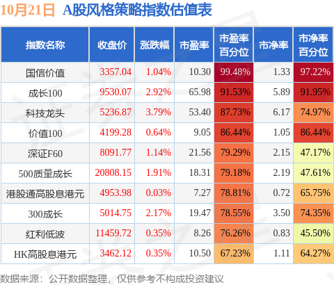风格策略指数方面,国信价值的市盈率百分位较高,为99.48%。而HK高股息港元的市盈率百分位较低,为67.23%。