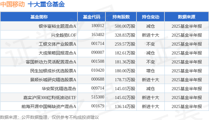 持有中国移动最多的基金为银华富裕主题混合A,目前规模为107.06亿元,最新净值4.43(10月21日),较上一交易日上涨0.48%,近一年上涨3.01%。该基金现任基金经理为焦巍。