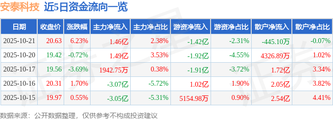 10月21日的资金流向数据方面,主力资金净流入1.46亿元,占总成交额2.38%,游资资金净流出1.42亿元,占总成交额2.31%,散户资金净流出445.1万元,占总成交额0.07%。