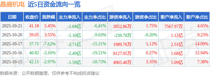 10月21日的资金流向数据方面,主力资金净流出1.04亿元,占总成交额6.41%,游资资金净流入2852.86万元,占总成交额1.75%,散户资金净流入7567.97万元,占总成交额4.65%。