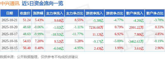 证券之星消息,截至2025年10月21日收盘,中兴通讯(000063)报收于51.24元,上涨5.43%,换手率5.57%,成交量224.21万手,成交额112.78亿元。
