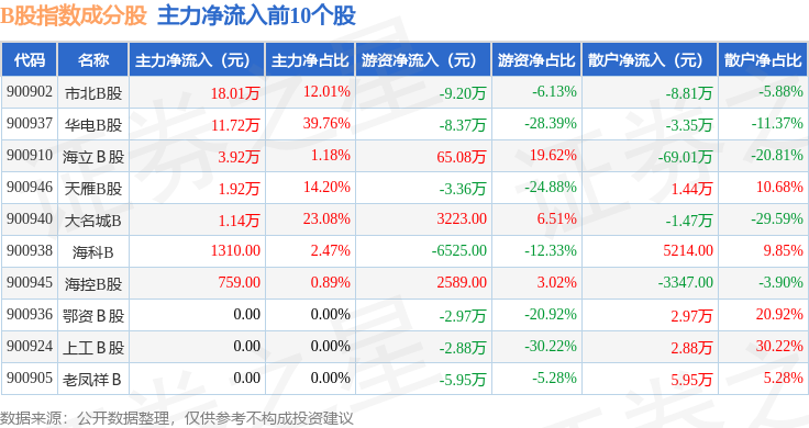 资金流向方面,B股指数(000003)成份股当日主力资金净流出合计103.69万元,游资资金净流出合计33.31万元,散户资金净流入合计137.0万元。成份股资金流向详情见下表: