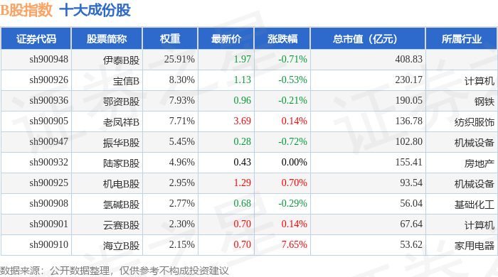 证券之星消息,10月22日,B股指数(000003)报收于260.41点,跌0.38%,成交1.4亿元,换手率0.26%。当日该指数成份股中,上涨的有8家,海立B股以7.65%的涨幅领涨,下跌的有28家,华谊B股以8.3%的跌幅领跌。
