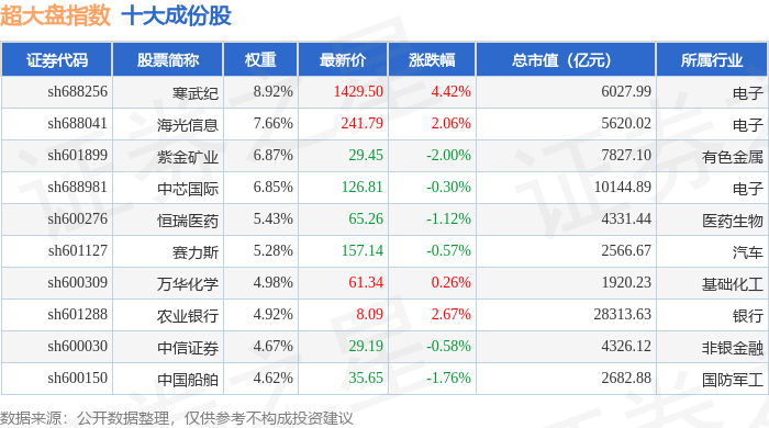 证券之星消息,10月22日,超大盘(000043)指数报收于2648.89点,涨0.58%,成交798.93亿元,换手率0.23%。当日该指数成份股中,上涨的有11家,寒武纪以4.42%的涨幅领涨,下跌的有9家,紫金矿业以2.0%的跌幅领跌。