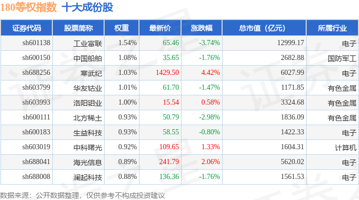 证券之星消息,10月22日,180等权(000051)指数报收于9274.25点,跌0.44%,成交2453.19亿元,换手率0.48%。当日该指数成份股中,上涨的有70家,寒武纪以4.42%的涨幅领涨,下跌的有102家,特变电工以4.43%的跌幅领跌。