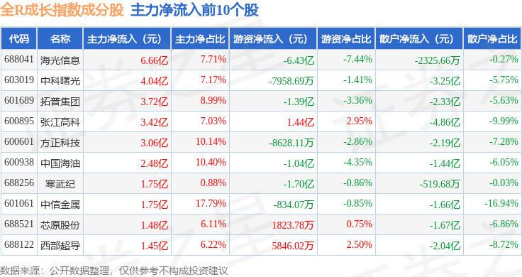 资金流向方面,全R成长(000059)指数成份股当日主力资金净流出合计133.87亿元,游资资金净流入合计44.51亿元,散户资金净流入合计89.36亿元。成份股资金流向详情见下表: