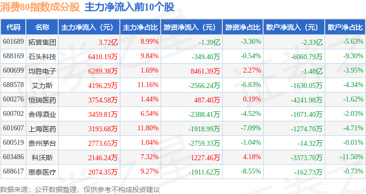 资金流向方面,消费80(000069)指数成份股当日主力资金净流出合计10.31亿元,游资资金净流入合计5.51亿元,散户资金净流入合计4.79亿元。成份股资金流向详情见下表: