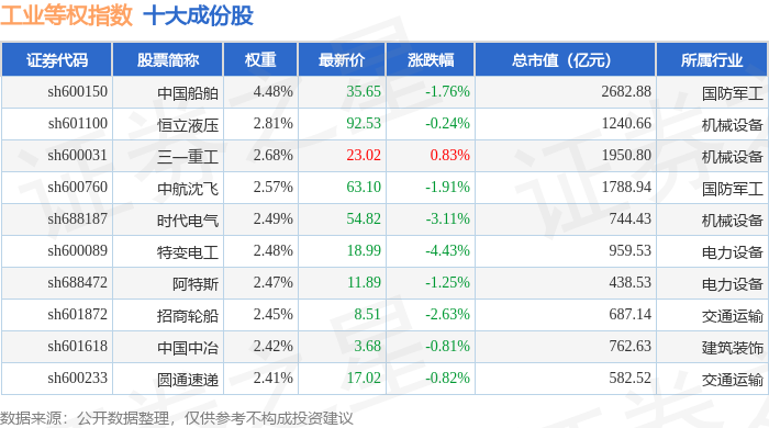 证券之星消息,10月22日,工业等权(000072)指数报收于2979.11点,跌0.77%,成交353.42亿元,换手率0.63%。当日该指数成份股中,上涨的有16家,四川路桥以3.75%的涨幅领涨,下跌的有31家,特变电工以4.43%的跌幅领跌。