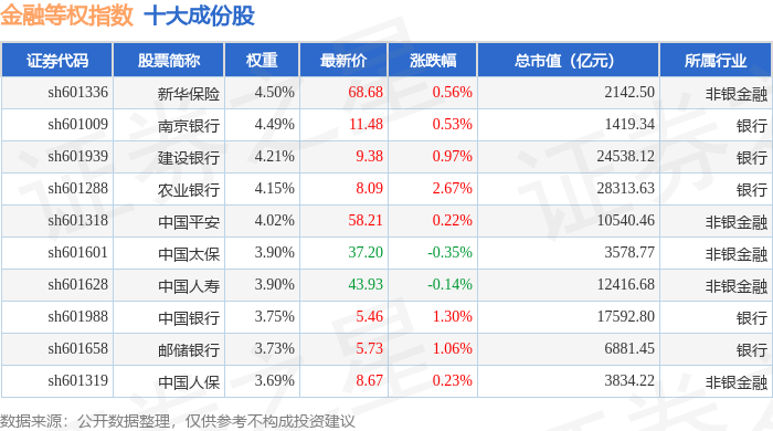 证券之星消息,10月22日,金融等权(000076)指数报收于5696.4点,涨0.51%,成交423.05亿元,换手率0.32%。当日该指数成份股中,上涨的有20家,农业银行以2.67%的涨幅领涨,下跌的有10家,华泰证券以2.06%的跌幅领跌。
