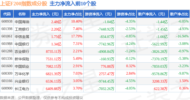 资金流向方面,上证F200(000098)指数成份股当日主力资金净流出合计109.15亿元,游资资金净流入合计33.32亿元,散户资金净流入合计75.83亿元。成份股资金流向详情见下表: