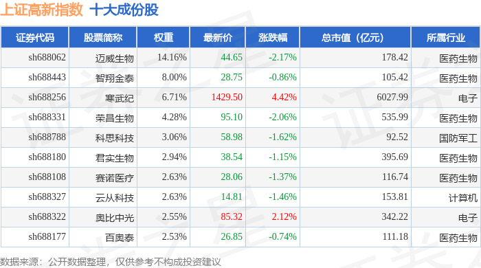 证券之星消息,10月22日,上证高新(000131)指数报收于3696.23点,跌0.41%,成交472.1亿元,换手率1.38%。当日该指数成份股中,上涨的有13家,寒武纪以4.42%的涨幅领涨,下跌的有37家,七一二以2.99%的跌幅领跌。