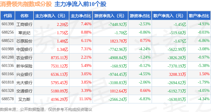 资金流向方面,消费领先(000148)指数成份股当日主力资金净流出合计30.4亿元,游资资金净流入合计12.13亿元,散户资金净流入合计18.27亿元。成份股资金流向详情见下表: