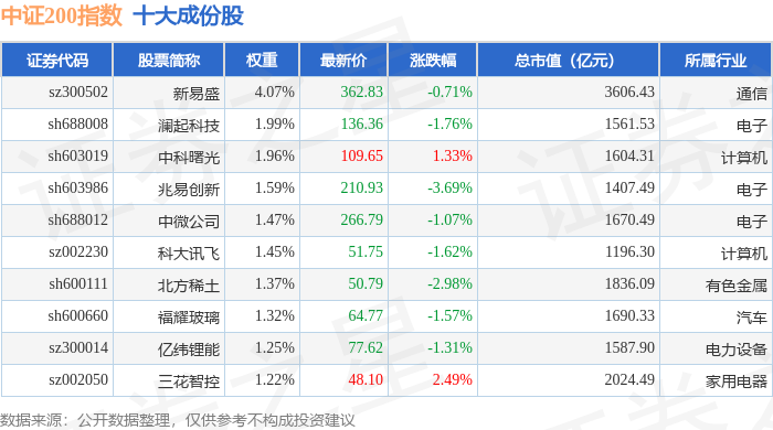 中证200(000904)指数十大成份股详情如下: