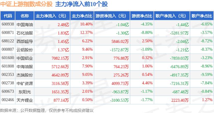 资金流向方面,中证上游(000961)指数成份股当日主力资金净流出合计29.37亿元,游资资金净流入合计4.82亿元,散户资金净流入合计24.55亿元。成份股资金流向详情见下表: