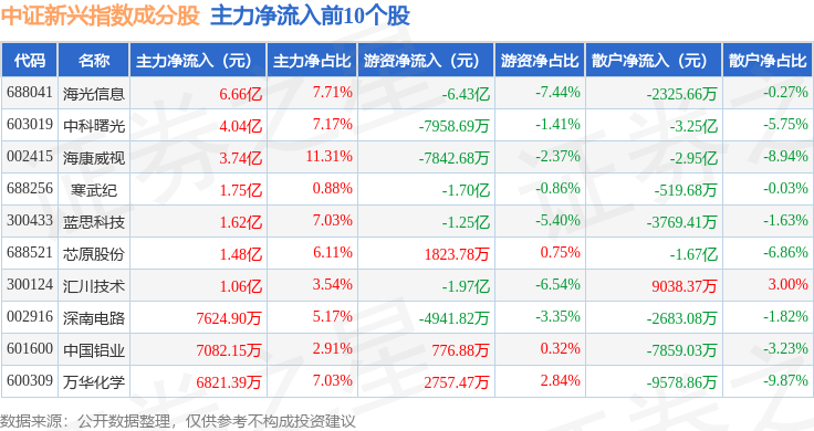 资金流向方面,中证新兴(000964)指数成份股当日主力资金净流出合计110.37亿元,游资资金净流入合计44.41亿元,散户资金净流入合计65.96亿元。成份股资金流向详情见下表: