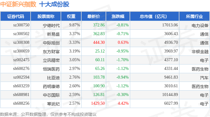 证券之星消息,10月22日,中证新兴(000964)指数报收于10991.1点,跌0.64%,成交2500.77亿元,换手率1.03%。当日该指数成份股中,上涨的有24家,寒武纪以4.42%的涨幅领涨,下跌的有74家,三环集团以5.0%的跌幅领跌。