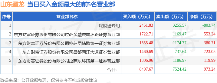 证券之星消息,沪深交易所2025年10月22日公布的交易公开信息显示,山东墨龙(002490)因日涨幅偏离值达到7%的前5只证券登上龙虎榜。此次是近5个交易日内第3次上榜。