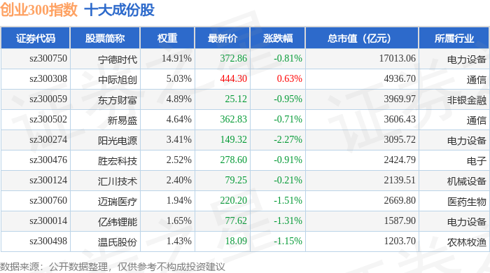 证券之星消息,10月22日,创业300(399012)指数报收于4298.54点,跌0.73%,成交2312.65亿元,换手率2.26%。当日该指数成份股中,上涨的有93家,新强联以8.49%的涨幅领涨,下跌的有200家,万辰集团以10.86%的跌幅领跌。