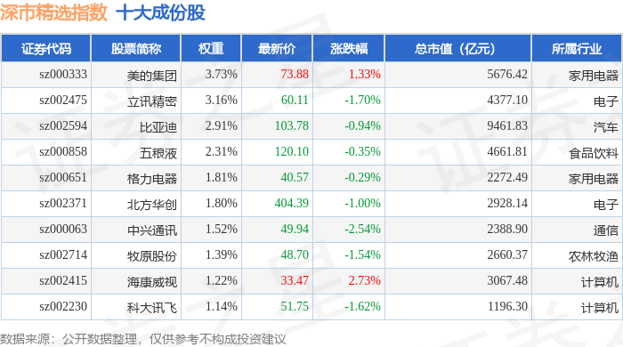 资金流向方面,深市精选(399013)指数成份股当日主力资金净流出合计93.82亿元,游资资金净流入合计28.09亿元,散户资金净流入合计65.73亿元。成份股资金流向详情见下表: