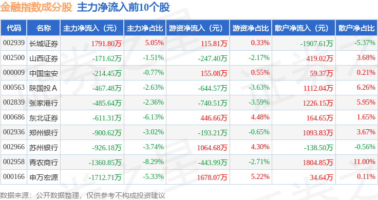 资金流向方面,金融指数(399240)成份股当日主力资金净流出合计23.19亿元,游资资金净流入合计8.21亿元,散户资金净流入合计14.98亿元。成份股资金流向详情见下表: