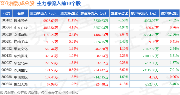 资金流向方面,文化指数(399248)成份股当日主力资金净流出合计1484.23万元,游资资金净流出合计1249.87万元,散户资金净流入合计2734.1万元。成份股资金流向详情见下表: