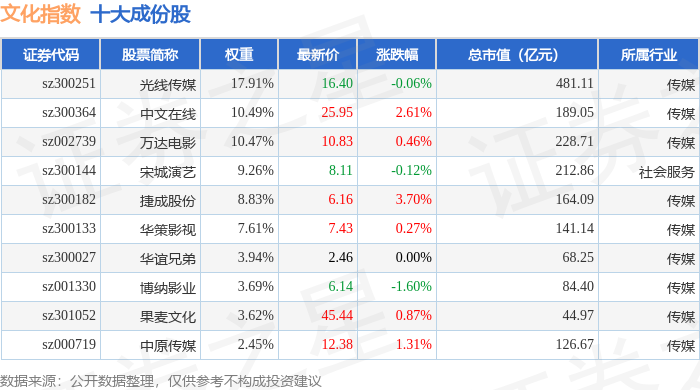 文化指数(399248)十大成份股详情如下: