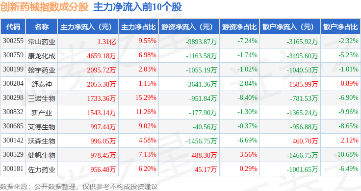 资金流向方面,创新药械(399265)指数成份股当日主力资金净流出合计2.31亿元,游资资金净流出合计9588.32万元,散户资金净流入合计3.27亿元。成份股资金流向详情见下表: