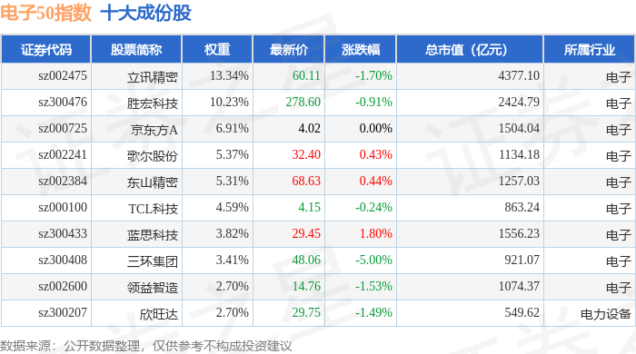 证券之星消息,10月22日,电子50(399281)指数报收于4453.38点,跌0.73%,成交585.64亿元,换手率1.61%。当日该指数成份股中,上涨的有14家,奋达科技以3.28%的涨幅领涨,下跌的有33家,三环集团以5.0%的跌幅领跌。
