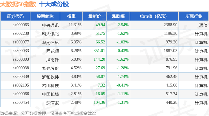 证券之星消息,10月22日,大数据50(399282)指数报收于5386.55点,跌1.26%,成交341.73亿元,换手率1.91%。当日该指数成份股中,上涨的有4家,顺网科技以3.95%的涨幅领涨,下跌的有45家,星网锐捷以4.73%的跌幅领跌。