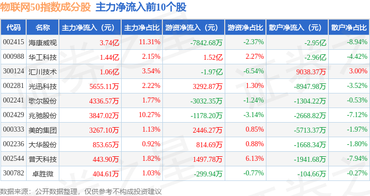 资金流向方面,物联网50(399285)指数成份股当日主力资金净流出合计37.71亿元,游资资金净流入合计15.97亿元,散户资金净流入合计21.74亿元。成份股资金流向详情见下表: