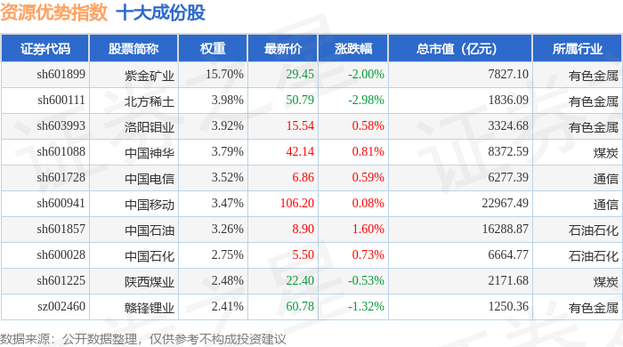 证券之星消息,10月22日,资源优势(399319)指数报收于3030.76点,跌0.86%,成交941.85亿元,换手率1.18%。当日该指数成份股中,上涨的有28家,石化油服以10.0%的涨幅领涨,下跌的有69家,平煤股份以5.2%的跌幅领跌。
