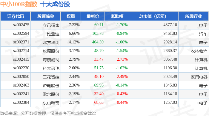 证券之星消息,10月22日,中小100R(399333)指数报收于9730.98点,跌0.66%,成交1067.57亿元,换手率1.3%。当日该指数成份股中,上涨的有31家,荣盛石化以3.2%的涨幅领涨,下跌的有68家,华天科技以6.26%的跌幅领跌。