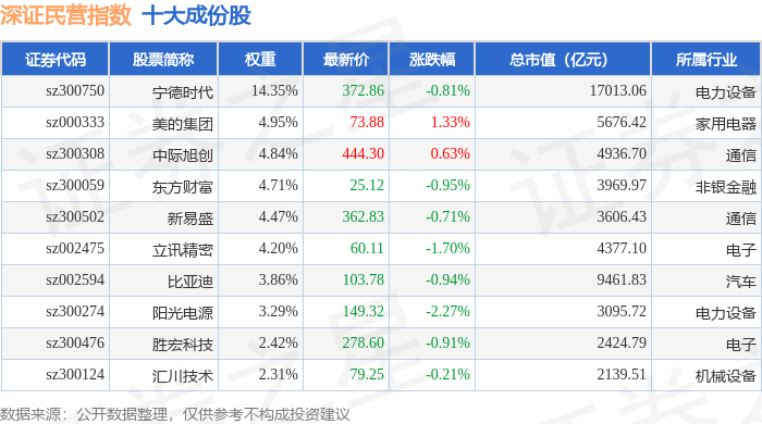 深证民营(399337)指数十大成份股详情如下: