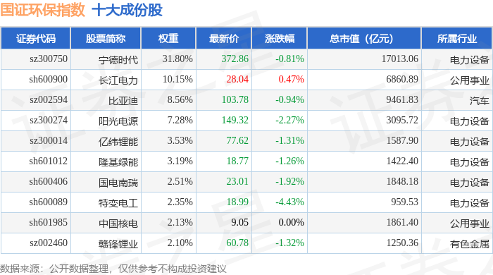 证券之星消息,10月22日,国证环保(399358)指数报收于5410.18点,跌1.03%,成交582.08亿元,换手率0.88%。当日该指数成份股中,上涨的有9家,桂冠电力以0.95%的涨幅领涨,下跌的有29家,天赐材料以5.92%的跌幅领跌。
