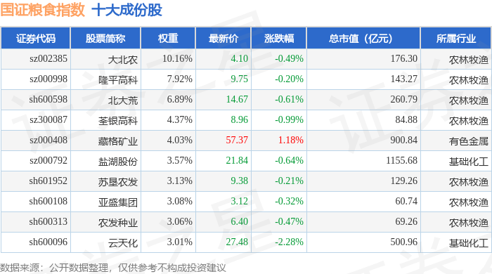 证券之星消息,10月22日,国证粮食(399365)指数报收于12489.82点,跌0.8%,成交112.12亿元,换手率1.44%。当日该指数成份股中,上涨的有9家,华邦健康以3.46%的涨幅领涨,下跌的有40家,东方铁塔以7.13%的跌幅领跌。