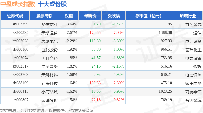 证券之星消息,10月22日,中盘成长(399374)指数报收于4273.85点,跌0.6%,成交733.29亿元,换手率1.5%。当日该指数成份股中,上涨的有32家,天孚通信以7.08%的涨幅领涨,下跌的有64家,天赐材料以5.92%的跌幅领跌。