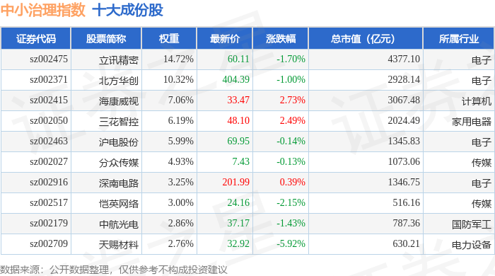 中小治理(399650)指数十大成份股详情如下: