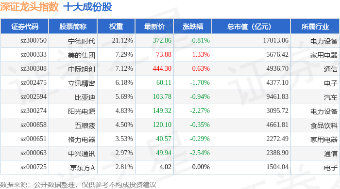 证券之星消息,10月22日,深证龙头(399653)指数报收于2995.98点,跌0.56%,成交962.5亿元,换手率1.01%。当日该指数成份股中,上涨的有14家,海康威视以2.73%的涨幅领涨,下跌的有35家,万辰集团以10.86%的跌幅领跌。