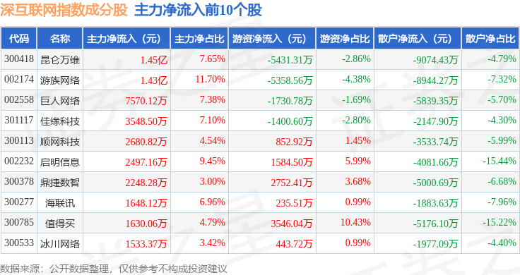 资金流向方面,深互联网(399675)指数成份股当日主力资金净流出合计22.02亿元,游资资金净流入合计8.75亿元,散户资金净流入合计13.26亿元。成份股资金流向详情见下表: