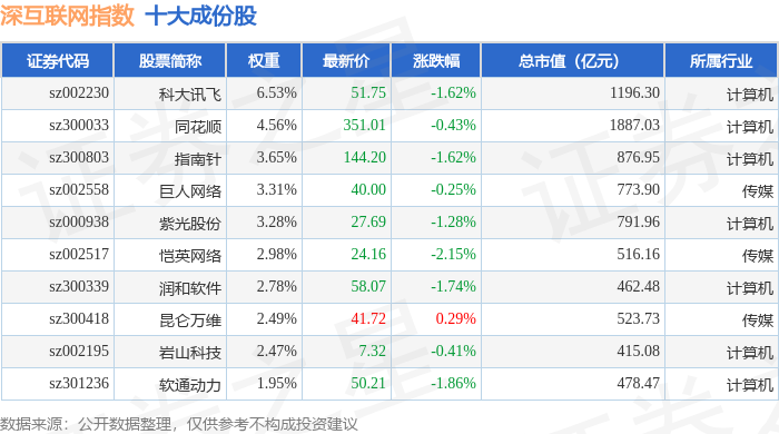 深互联网(399675)指数十大成份股详情如下: