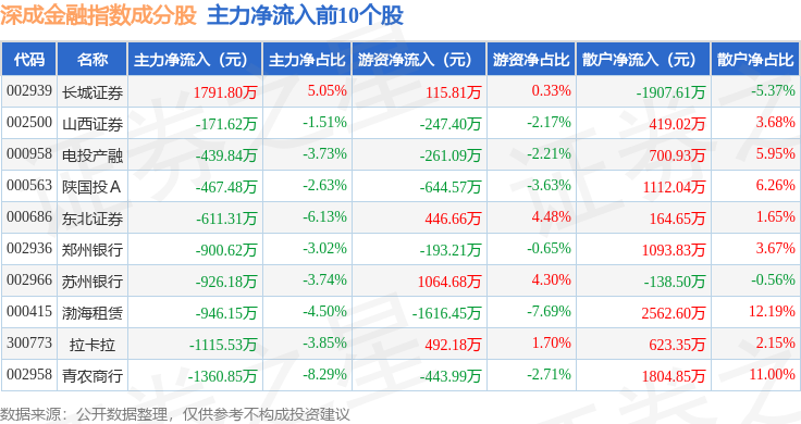 资金流向方面,深成金融(399686)指数成份股当日主力资金净流出合计17.85亿元,游资资金净流入合计6.63亿元,散户资金净流入合计11.22亿元。成份股资金流向详情见下表: