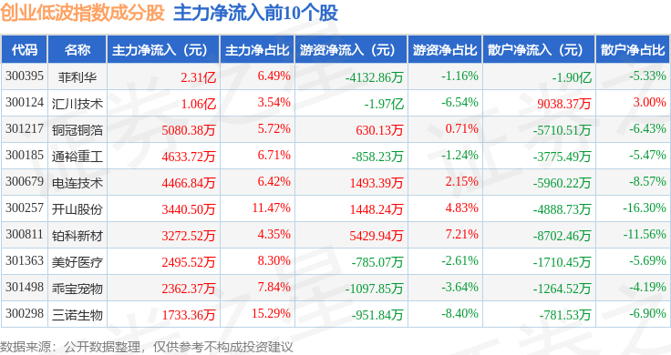 资金流向方面,创业低波(399692)指数成份股当日主力资金净流出合计14.5亿元,游资资金净流入合计2.65亿元,散户资金净流入合计11.85亿元。成份股资金流向详情见下表: