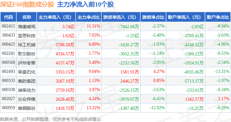 资金流向方面,深证F60(399701)指数成份股当日主力资金净流出合计44.86亿元,游资资金净流入合计15.68亿元,散户资金净流入合计29.18亿元。成份股资金流向详情见下表: