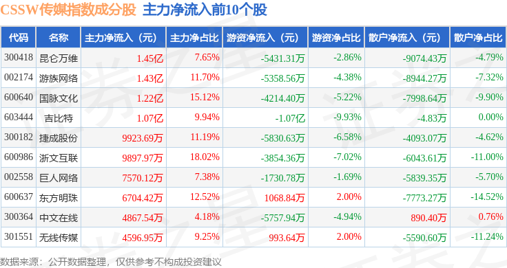 资金流向方面,CSSW传媒(399810)指数成份股当日主力资金净流入合计2.68亿元,游资资金净流出合计2.09亿元,散户资金净流出合计5929.84万元。成份股资金流向详情见下表: