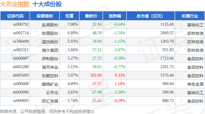 大农业(399814)指数十大成份股详情如下:
