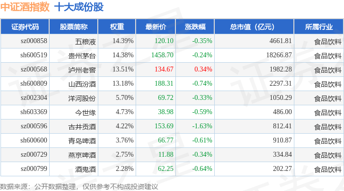 证券之星消息,10月22日,中证酒(399987)指数报收于5531.67点,跌0.36%,成交95.86亿元,换手率0.68%。当日该指数成份股中,上涨的有7家,百润股份以0.67%的涨幅领涨,下跌的有21家,会稽山以3.34%的跌幅领跌。