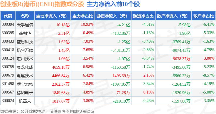 资金流向方面,创业板R(港币)(CNH)(470006)指数成份股当日主力资金净流出合计61.93亿元,游资资金净流入合计19.88亿元,散户资金净流入合计42.05亿元。成份股资金流向详情见下表: