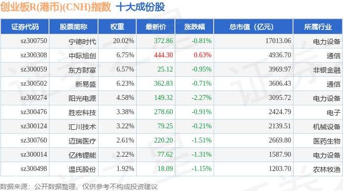 创业板R(港币)(CNH)(470006)指数十大成份股详情如下: