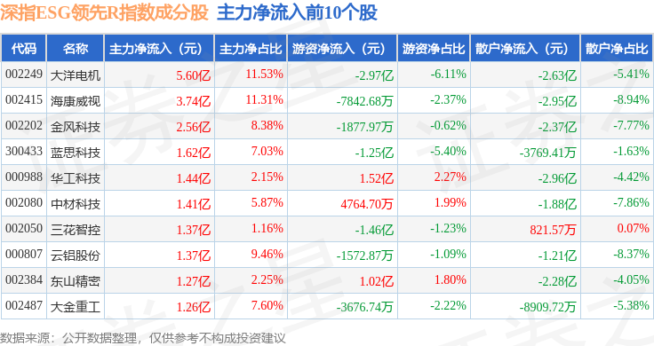 资金流向方面,深指ESG领先R(470029)指数成份股当日主力资金净流出合计95.21亿元,游资资金净流入合计35.79亿元,散户资金净流入合计59.41亿元。成份股资金流向详情见下表: