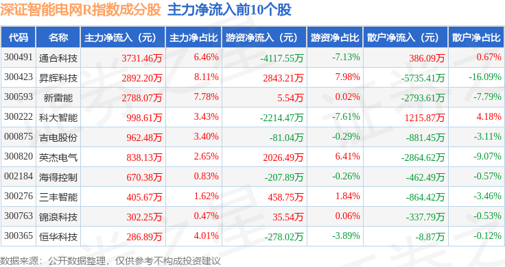 资金流向方面,深证智能电网R(470054)指数成份股当日主力资金净流出合计15.36亿元,游资资金净流入合计5.11亿元,散户资金净流入合计10.25亿元。成份股资金流向详情见下表: